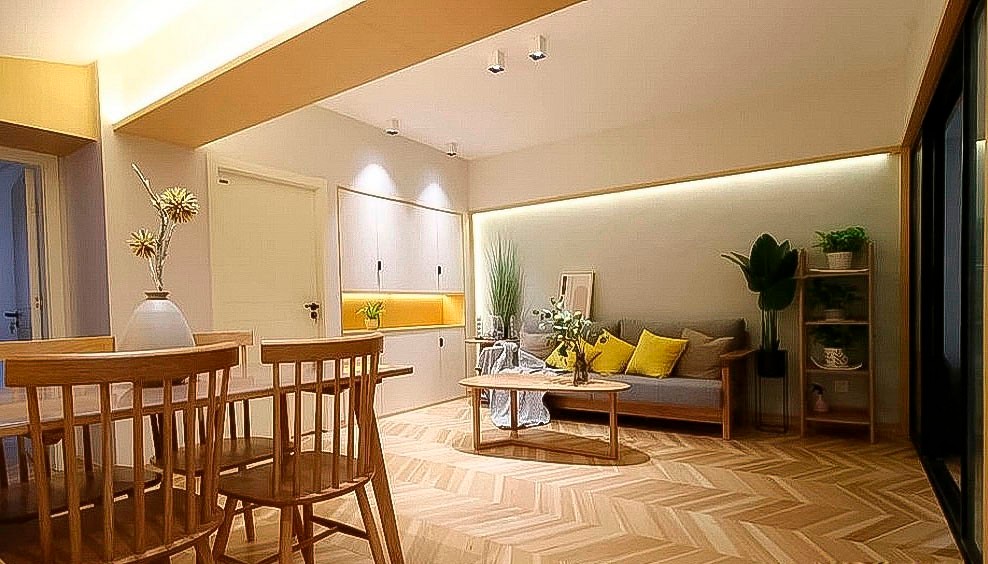 原木色元素充满着整个家,地面是整体实木多层鱼骨拼原木色地板,家里所有柜子是我们施工坊师傅现场打制的,柜门和敞开区贴面用的是科定木皮。 沙发墙后的L型线灯是利用原来的大梁凸出墙面8公分的层次加上木饰面边框做成的。 有了灯光让沙发墙变得更生动。