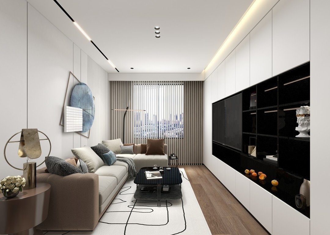 通过墙面和地面高反光度的大理石瓷砖来让视觉更有延伸感