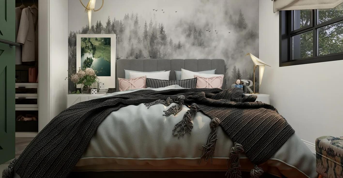 整体的色彩搭配比较大胆,产生凌乱的美感,在深浅配色中显露的空间层次,只简约几笔便将空间氛围感提升 。