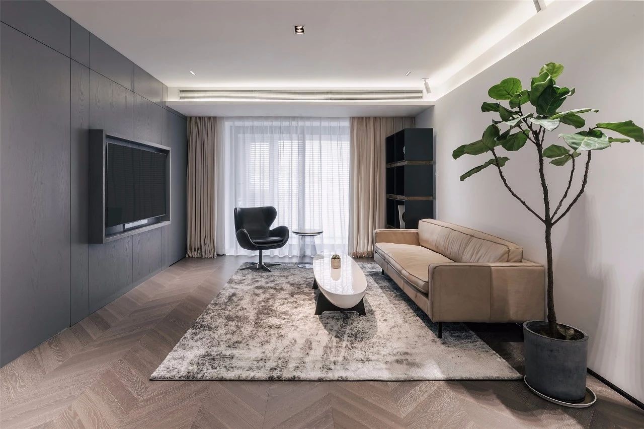 极具肌理感的灰色木饰面与白色乳胶漆相融合使空间有很强的现代感。而木色地板与冷灰的色调又拉回一定的平衡,空间与材料之间的衔接细节也相应体现。