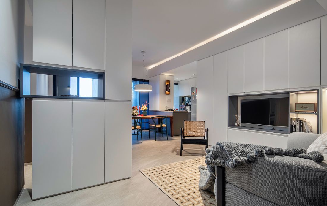 入户门厅采用鞋柜作为玄关隔断,既能解决收纳的同时,也保护内部的隐私,巧妙利用镂空部分,解决刻板的隔断问题。功能上弱化了客厅,将主要的活动与交流区域放在了餐厅,电视柜是作为客厅与卫生间隔板,掏空了中间部分,让柜子保持收纳功能,同时将空间利用到***,