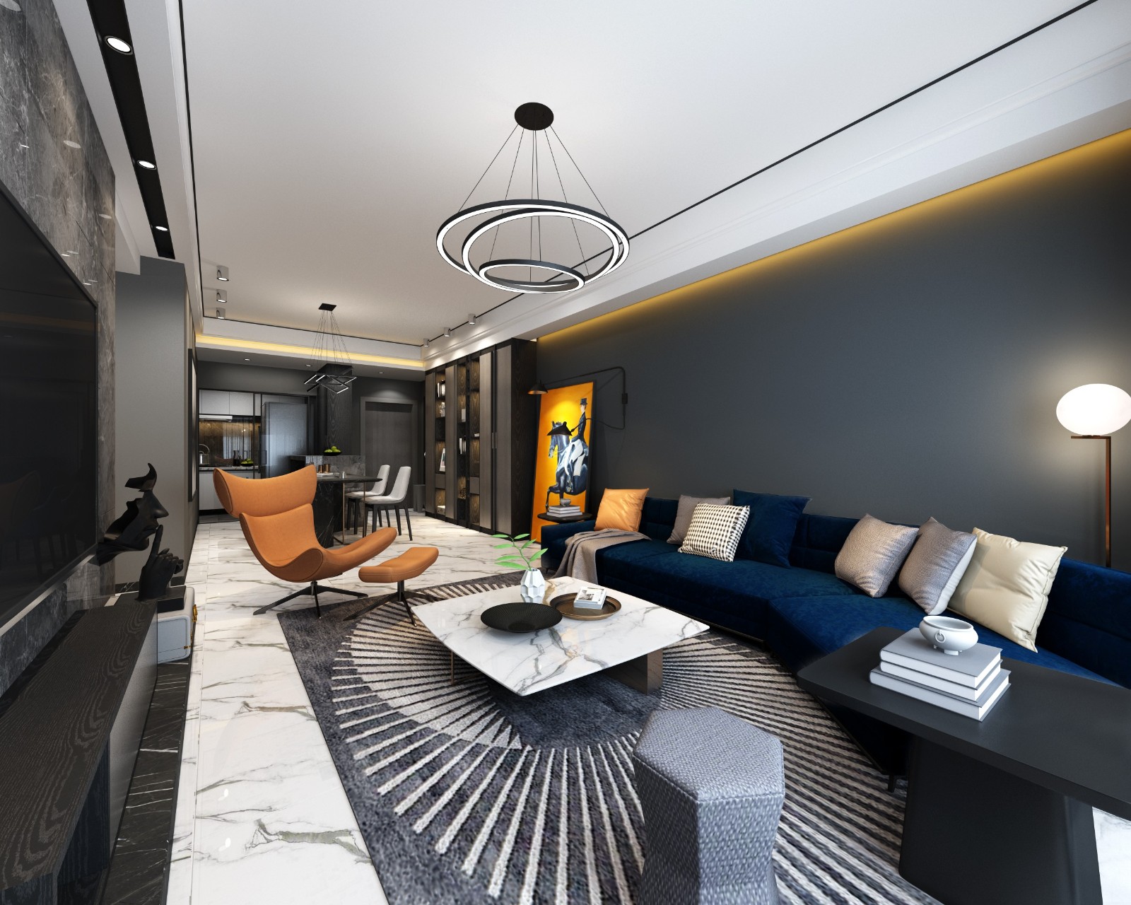 简洁的硬装打造更具包容性的空间,以中性灰色为主,加亮色点缀,提亮整体空间色彩。