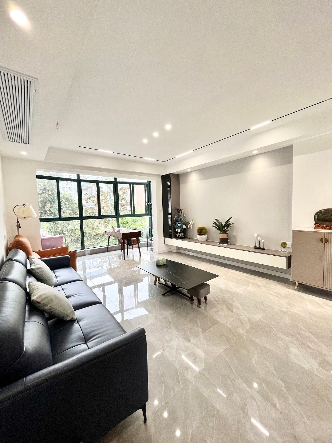 客厅空间采用的是无主灯设计,顶部以磁吸灯+筒灯的形式满足空间照明,四周大气简单的吊顶不仅轻松把中央空调嵌入进去,还能让客厅更具空间立体感,层次分明。