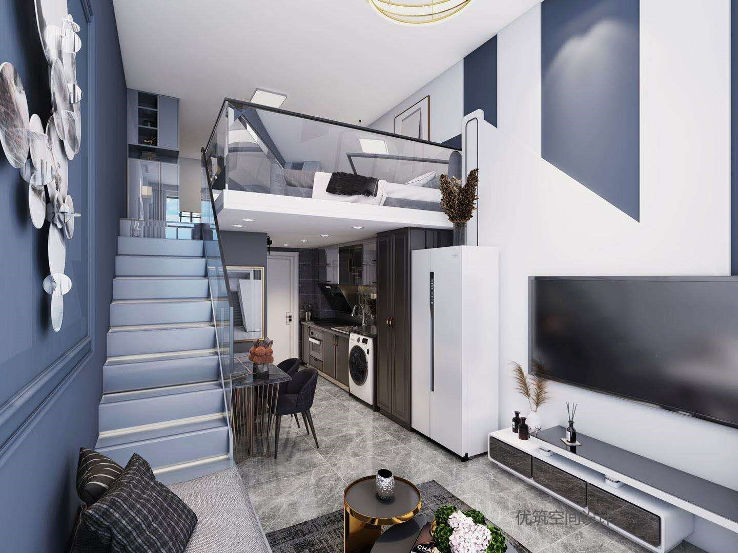 蓝色主色调设计,低调、沉稳、内敛。二楼半高隔断玻璃墙体,让空间的透气性更好,空间更有融合效果。