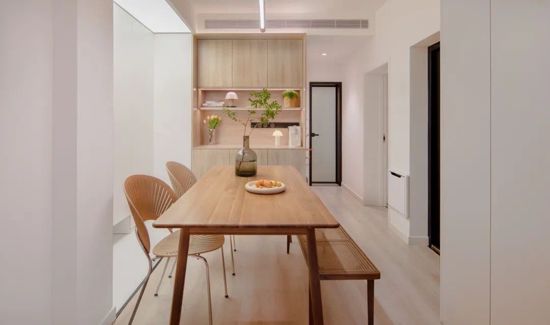改造后的客餐厅增加了水吧区域,饮水机、榨汁机等家用小电器可以收纳在这里,同时兼具储物功能。 在客餐厅活动的时候,方便用更短的动线满足多种需求。