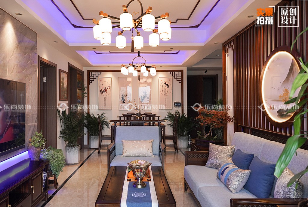 新中式讲究天圆地方,寓意着美好和谐,设计师采用方形檀木家具和圆形造型灯设计表达了对业主美好的祝愿。