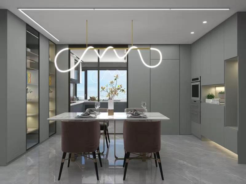餐厅使用大面积橱柜,增加储物空间,灰色基调看上去也大气轻奢