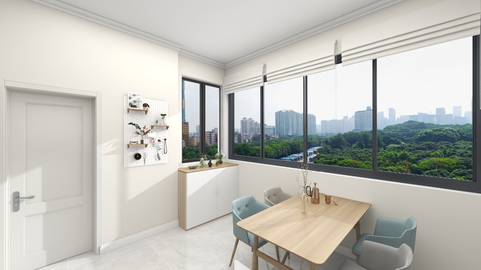 厨房与餐厅采用酒柜与鞋柜隔断,既起到了隔断区域的作用,又把空间利用了起来。厨房门采用吊滑门,大大节省了厨房空间