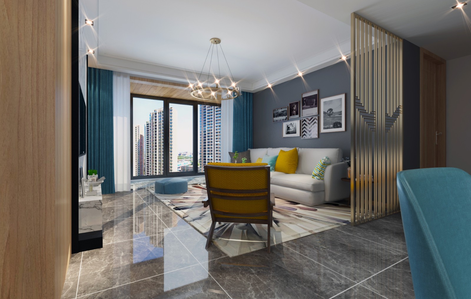 浅灰色的背景墙和水泥灯有一些清冷,但地毯又比较明亮
