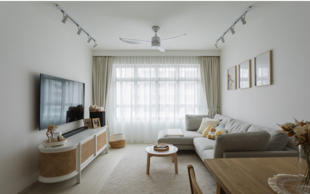 卧室空间以白色为主,空间整体呈现出简洁的视觉感,主卧的采光比较好,因此在窗帘的选择上是 奶油色+纱帘,天气好的时候光影也是透过纱帘营造出若隐若现的美感。空间整体无主灯设计,轨道灯+ 吊灯满足休憩环境的照明需求,在家具的选择上也是饱和度低的浅色系,搭配奶油质感的毛绒绒地毯,空 间的舒适感自然而然就出来了。