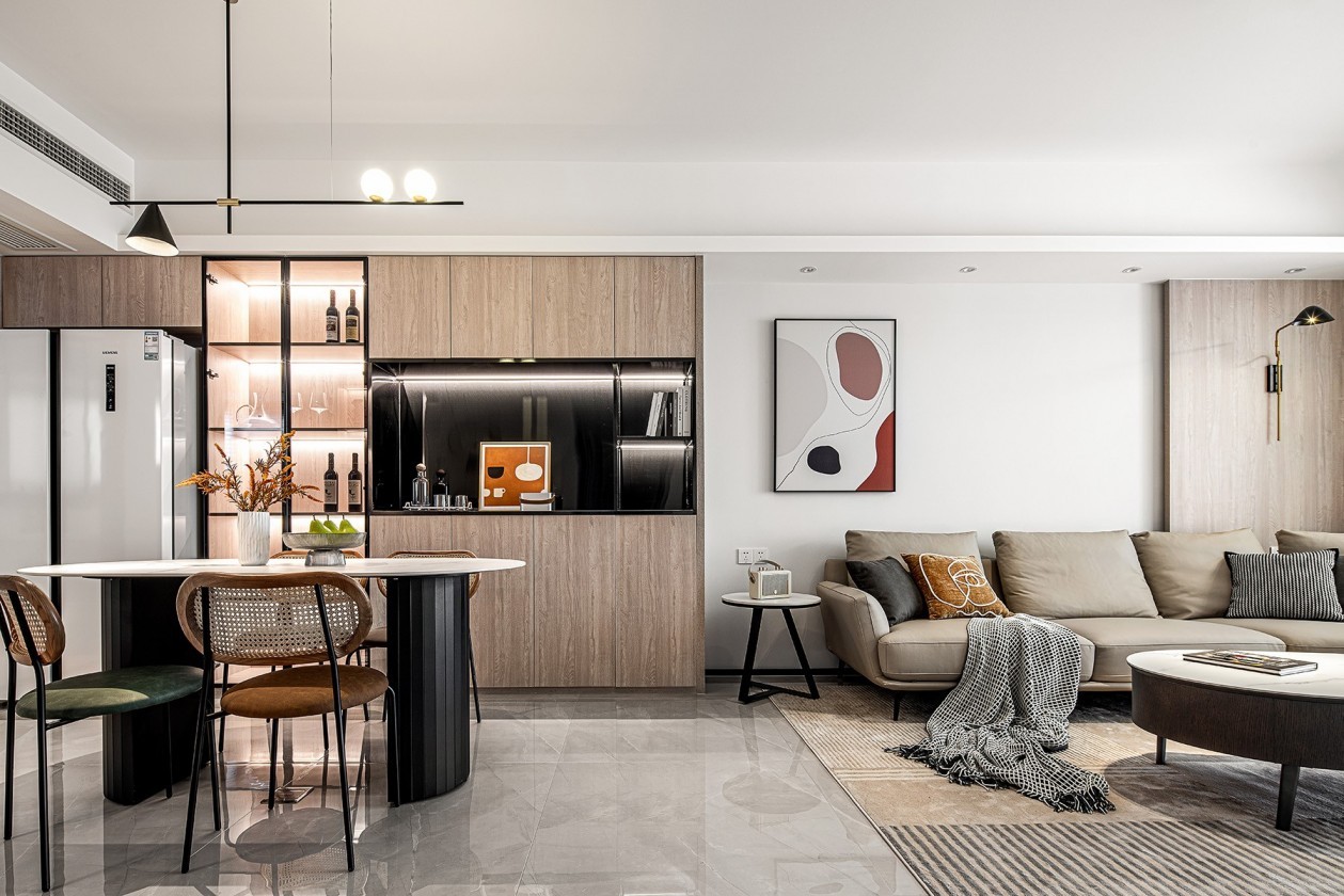 经典客餐厅一体式户型,客餐厅通透,整体,空间宽敞、动静分离,动线明确,设计突出实用的基础上,强化功能性,以原木质感的搭配形式,彰显简约轻松休闲的居家生活。