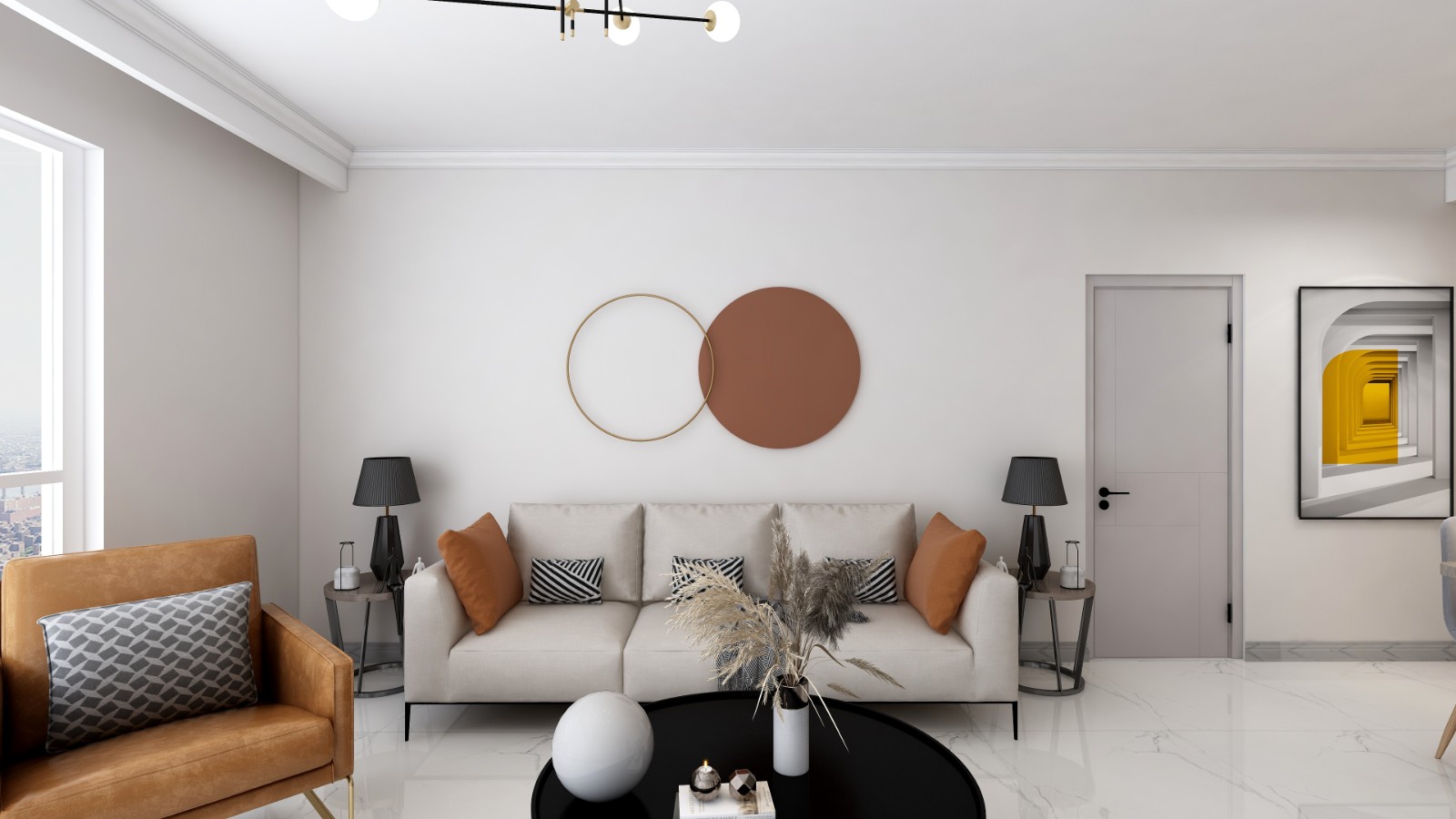 色彩上延用了莫兰迪灰色系,与家具的主体色做呼应。在单椅设计上,我选用了姜黄的亮色,给空间增添了明亮