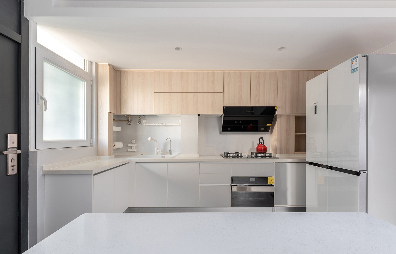 开放式厨房不光要做饭,赏心悦目更重要。U型布局让洗配切得到优化,让多种功能和收纳一应俱全,还能容纳一个巨型双开门冰箱。