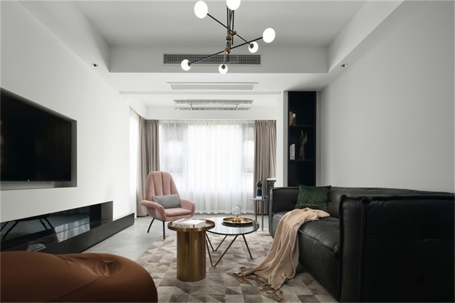 设计师对于空间的动线与视线所到之处都有着细节统一设计,特别是对于入户客厅及餐厅一体的公共空间,在配色处理上互相呼应,在材质选择上互相穿插、运用