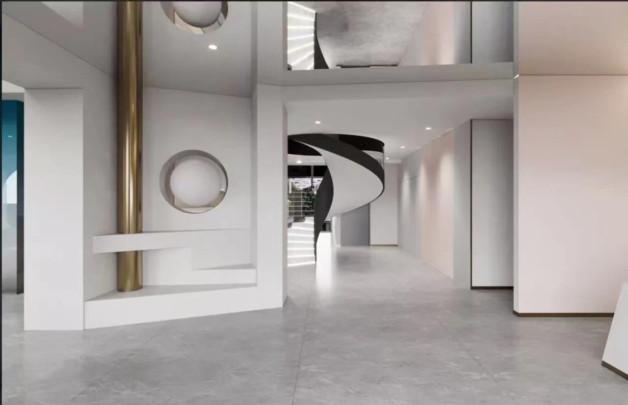 采用定制弧形楼梯,墙面及天面艺术造型设计,地面爱马仕灰色工艺砖。