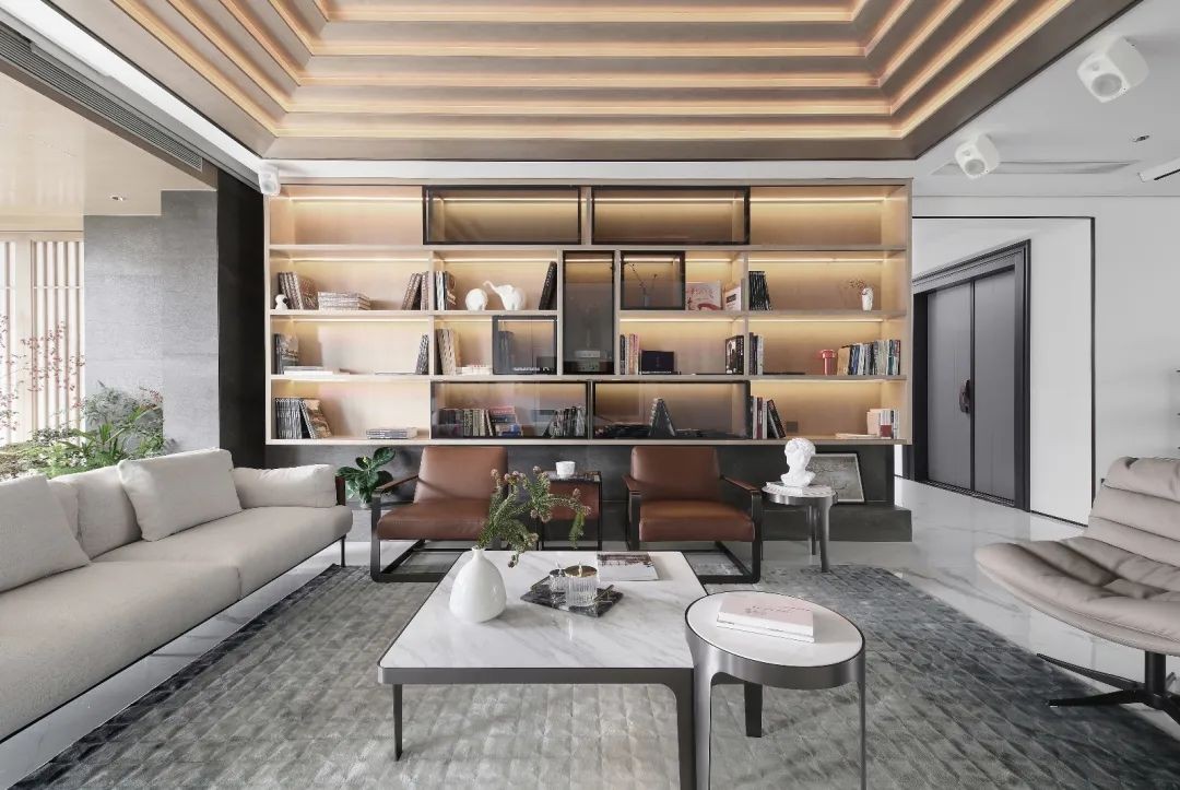 ▲沙发墙以定制的书架设计,书架上摆上书籍与装饰品,并在每一层书架都加入灯带设计,也让空间显得层次丰富而大气。