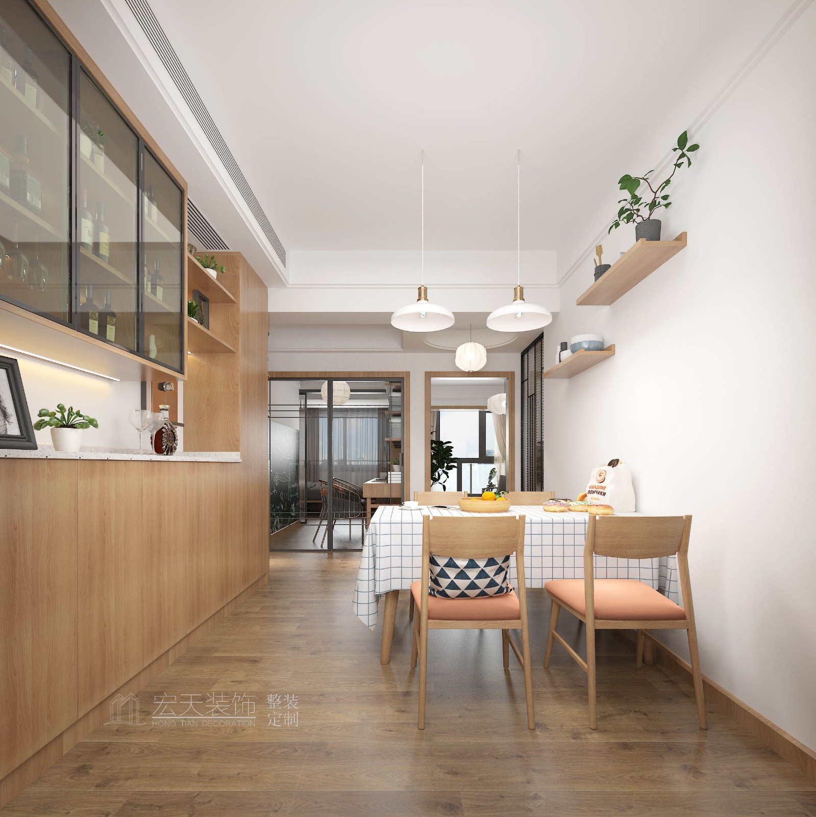 餐厅没有过多的色彩,提供了一个休闲的就餐空间,木色柜子及软装装饰和客厅相呼应