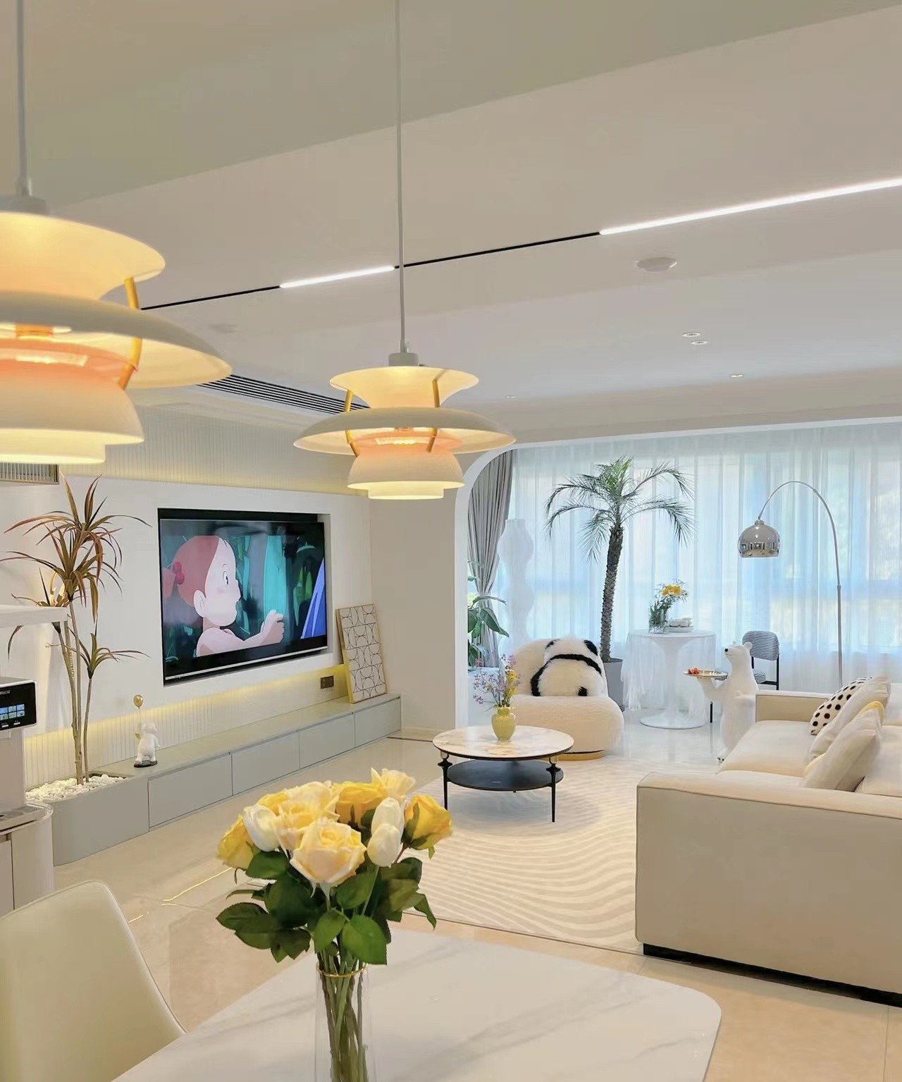 电视背景墙做了简单的设计,无主灯设计简约大气显层高,60平的客餐厅用了22个繁简的筒射灯再加五米左右的磁吸灯,光线明亮。