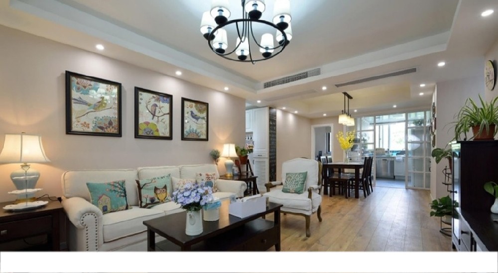餐厅处采用深色原木系家具,配合简易装饰灯及墙面装饰画,营造简洁温馨的就餐环境;厨房及餐厅处采用移门隔断,提高整个客厅的通透性,而不乏功能区间的使用便捷性。