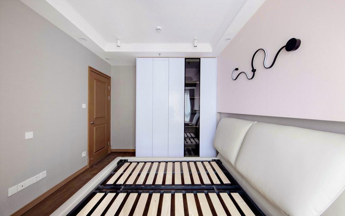 因为女主人酷爱粉色,设计师将床头用粉色点缀一下,使用面积不用过大,显得恰到好处,搭配米白皮质的软包床头,营造温馨放松的居家环境。