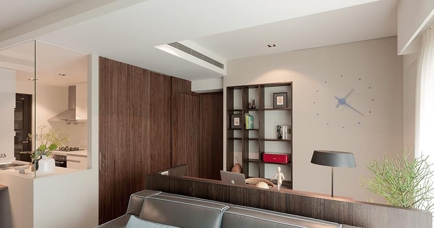 浅色调的牆面颜色搭配深色调的木质感来营造稳定且明亮的氛围。