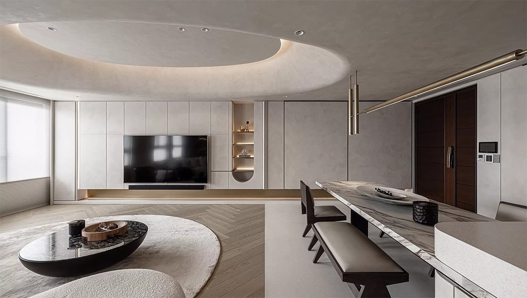 突显出弧型天花及线灯所相互交织的设计表现,让空间整体带来禅宗美学的感受。
