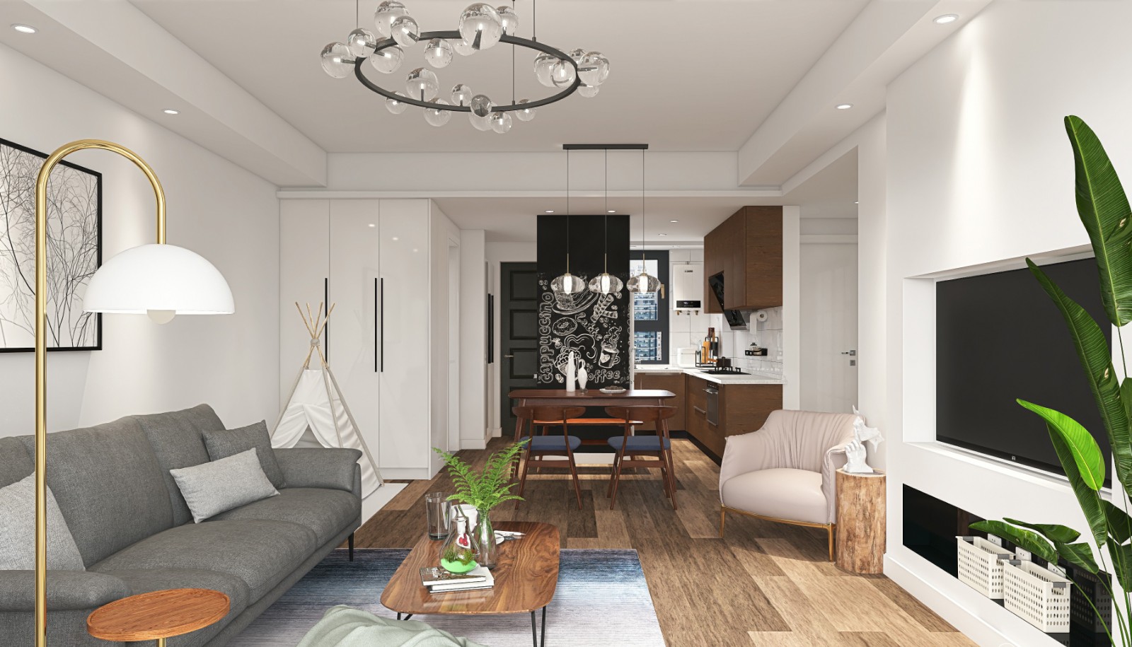 面积较小的桌椅搁置在木质地板上,为室内腾出了更为广阔的空间,给人丰富的想象空间