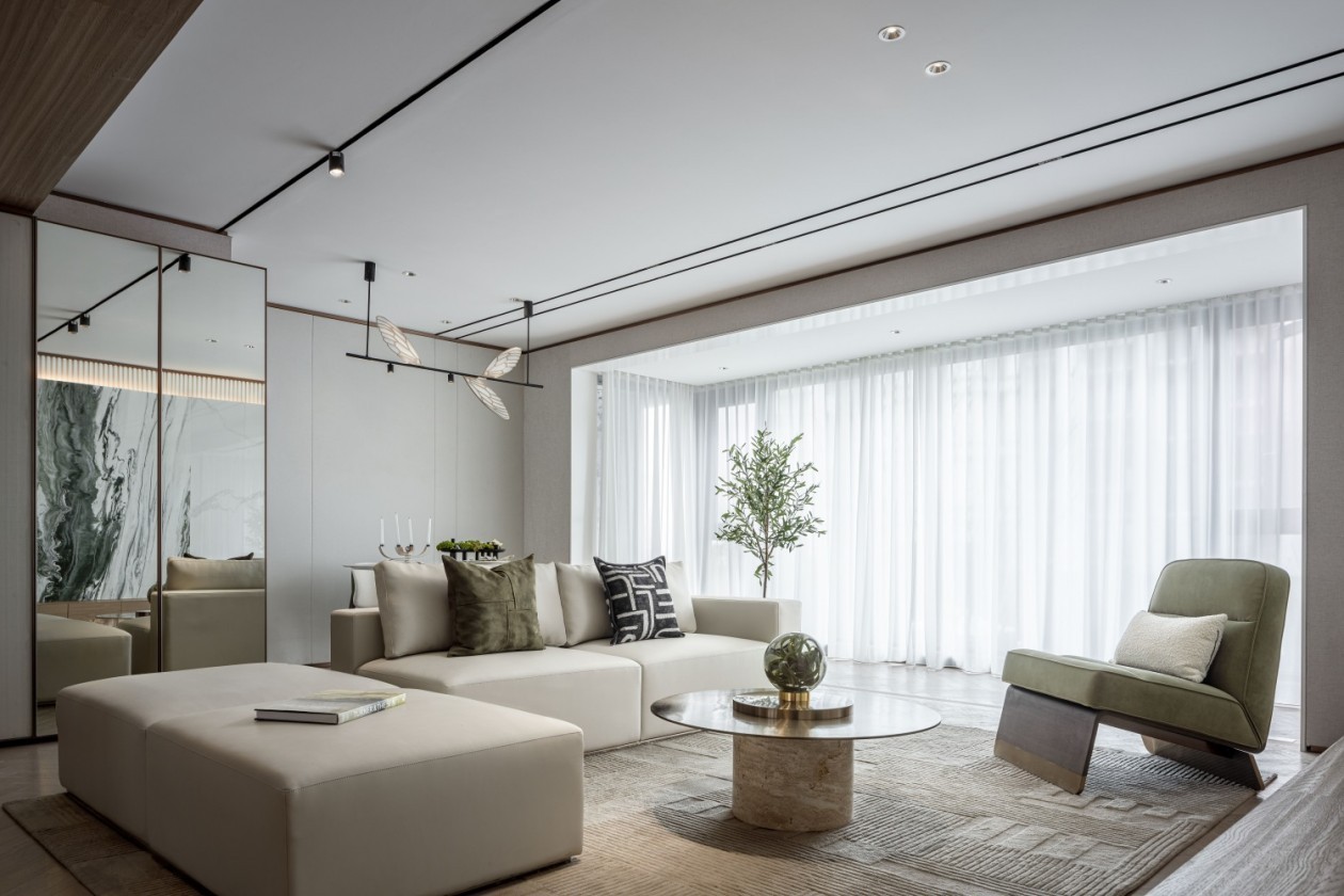 结合整体沉稳大气简约的现代主义设计语言与自然和谐共生脉络,将有机几何形态以及艺术收藏品的家具和装饰融入设计中,