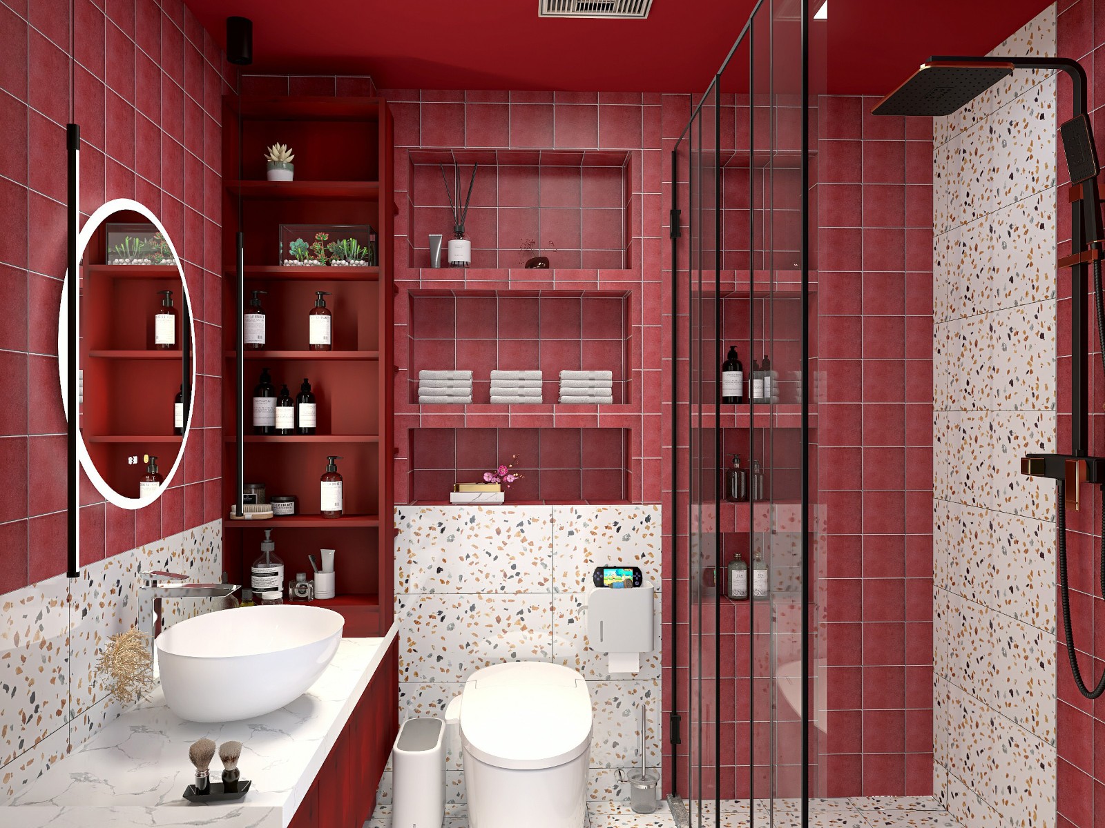 主卫的设计也与大局并不呼应,在材质的选用上小砖和水磨石混搭的风格,营造热情典雅的空间氛围。红色的瓷砖颜色是业主有意选择的,搭配白纹水磨石使其空间感不会过于压抑。