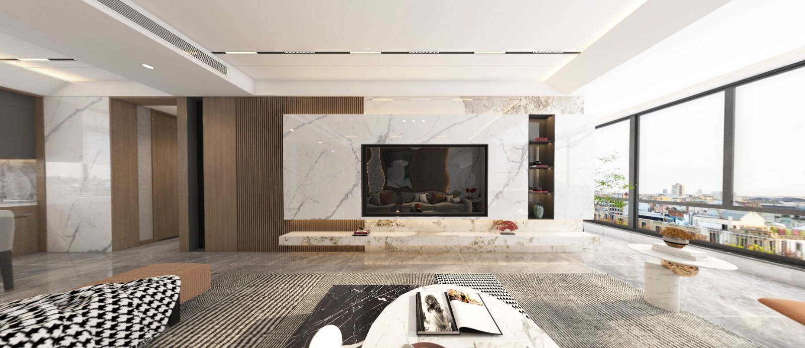 客厅空间木色和白色的温柔搭配,温和的色彩能瞬间将刚回家的女主人拉回到放松的状态,白色大理石和木饰面的呼应,将空间悠闲惬意的氛围拉满