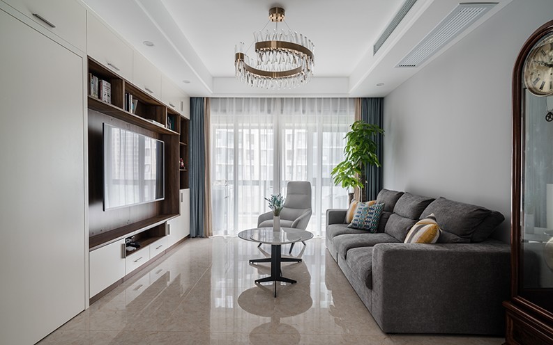 客厅的主题色调以简约派***系白色和灰色为主 胡桃木的钟及电视背景 与复古代表金属色吊灯互相辉映 使得整个简约风格的客厅更加稳重大气