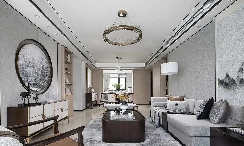 玄关处的端景柜给人一种对称和谐之美,配上一副风景画、新中式摆件,清新幽雅
