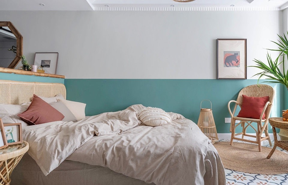 睡眠区我们选择了1m8*2m的榻榻米大床,并定制了经典格纹的藤编床头。藤编与亚麻最相配,客户在我们的建议下选择了搭配亚麻床品,既舒适又带有天然质感。