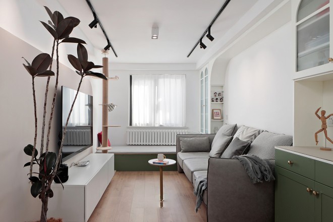 客厅靠窗新增的榻榻米既是储物区也可以是休息区,沙发与木作造型定制柜完美结合,落雪白与墨绿的色彩搭配清新自然,将空间的每一个较多都恰到好处的链接与利用,规整后的空间有定制的精美、有充分的自由、有舒适的空间感。