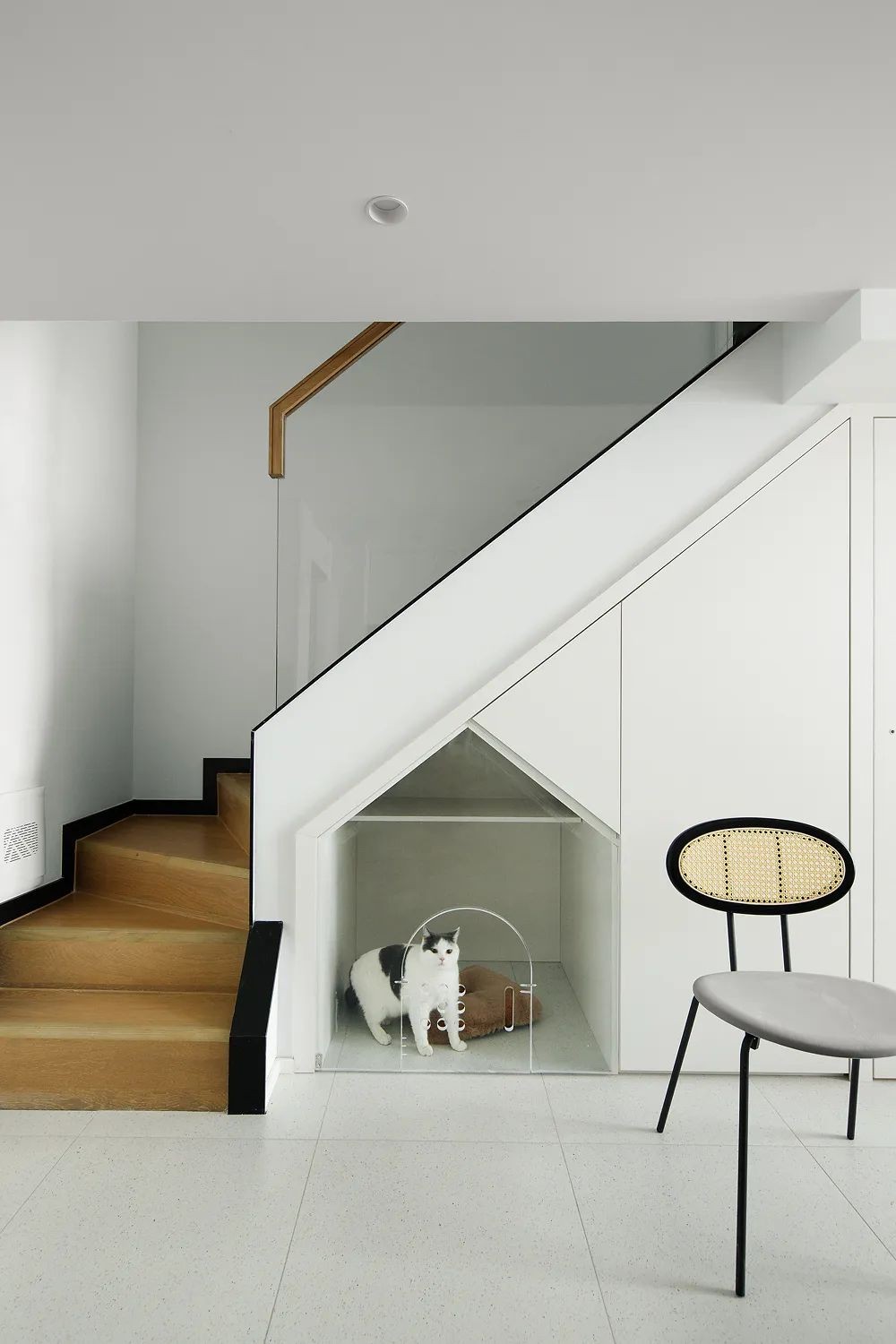 设计师利用楼梯下的部分空间打造透明的玻璃猫房,结合猫洞设计,方便猫主子随意进出。 另一部分则做成封闭式储物柜,将楼梯底部的空间充分利用,一旁卫生间门做隐形门处理,结合无把手柜门设计,使空间整体感更强,视觉上更显干净整洁。