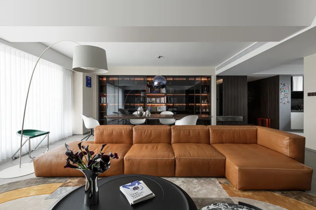 L型棕色沙发带来复古质感,左右两边洄游动线畅通,慵懒的单人沙发拥有十足的包裹感,让居住者能全然的放松身心。