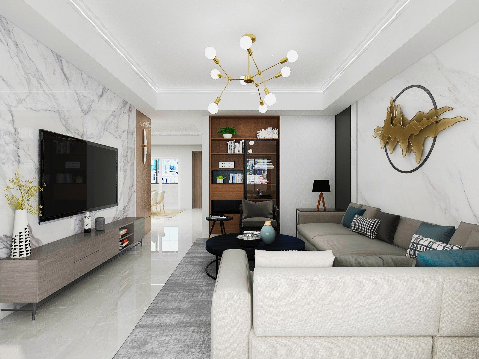 电视墙纳入屋主喜爱的石材纹理,特别挑选大理石纹磁砖铺述,并以不规则拼花方式呈现,营造个性的现代风貌,同时将石纹电视墙延展,电视柜同步以落地方式向两侧伸展,藉此拉阔电视墙尺度,无形敞开朗阔氛围。