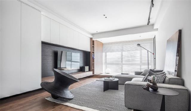整个电视墙凌驾于鞋柜与阳台柜的中间,利用原木色、白色、黑色,以及光面材质、哑光材质、手抓木纹材质,碰撞出强烈的空间层次感。