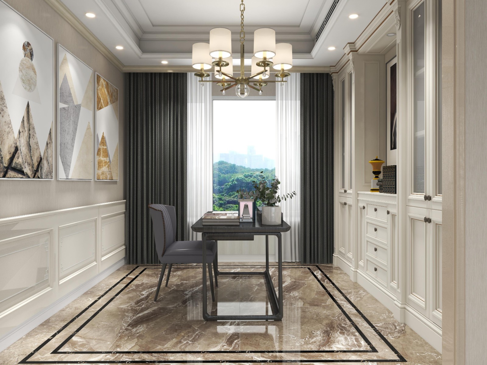 欧式风格比较适合稍大一点的户型,这个房子呢,三代人居住,需要书房来办公,我们需要把各个空间的动线距离尽量缩短。