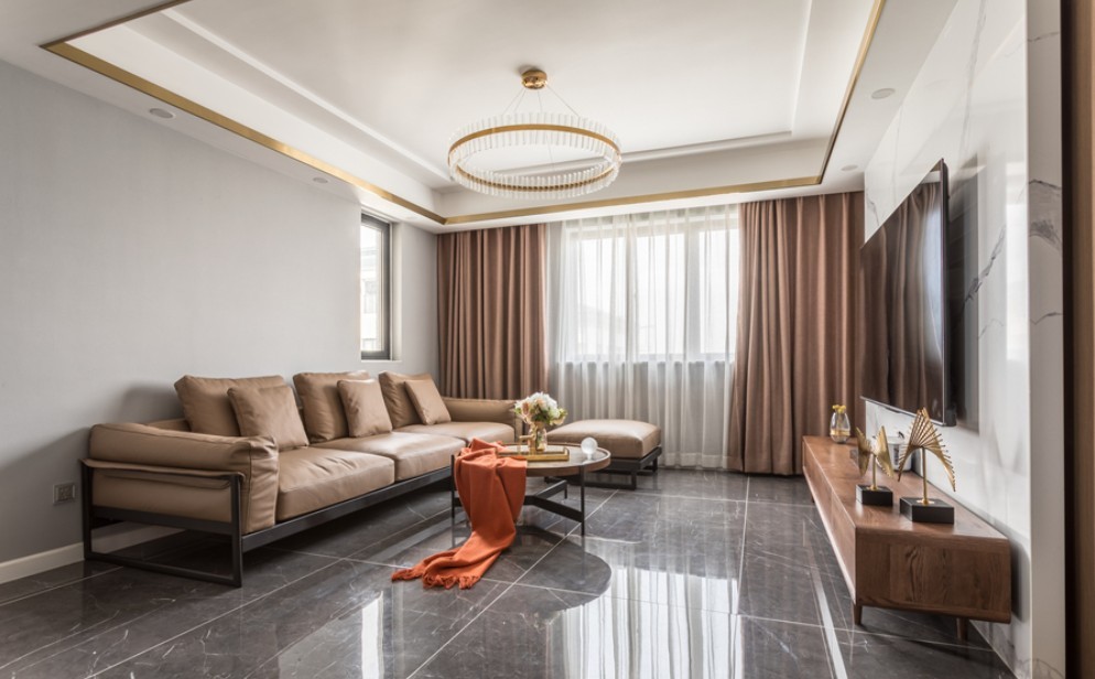 客厅整体色调偏向于冷色系,地面通铺灰色石纹地砖,搭配卡其色皮艺沙发、圆形茶几简约时尚、活力橙的窗帘点亮了空间,冷与暖的碰撞恰到好处;