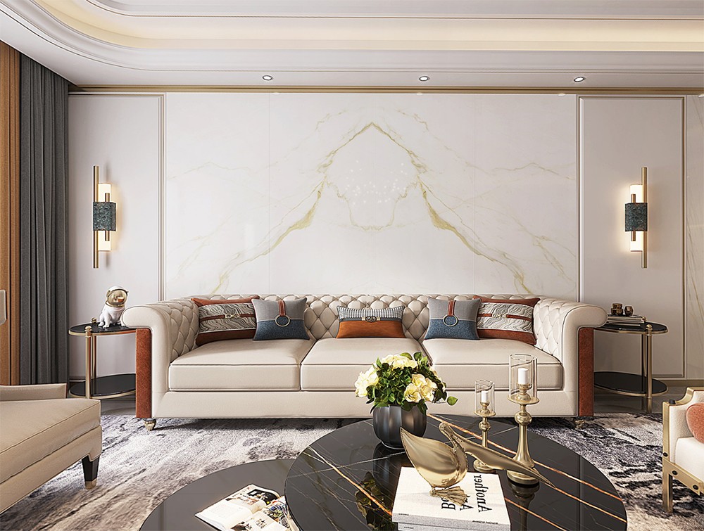 客厅电视背景墙采用大理石加硬包的设计,四片通顶大理石形成一幅画