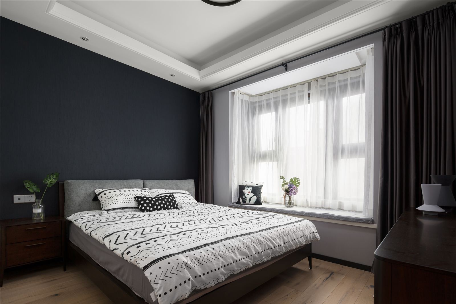 床头背景的纯黑色墙纸的运用,不仅增加了空间的层次感,而且还丰富了床头背景,使得背景无需挂装饰画。