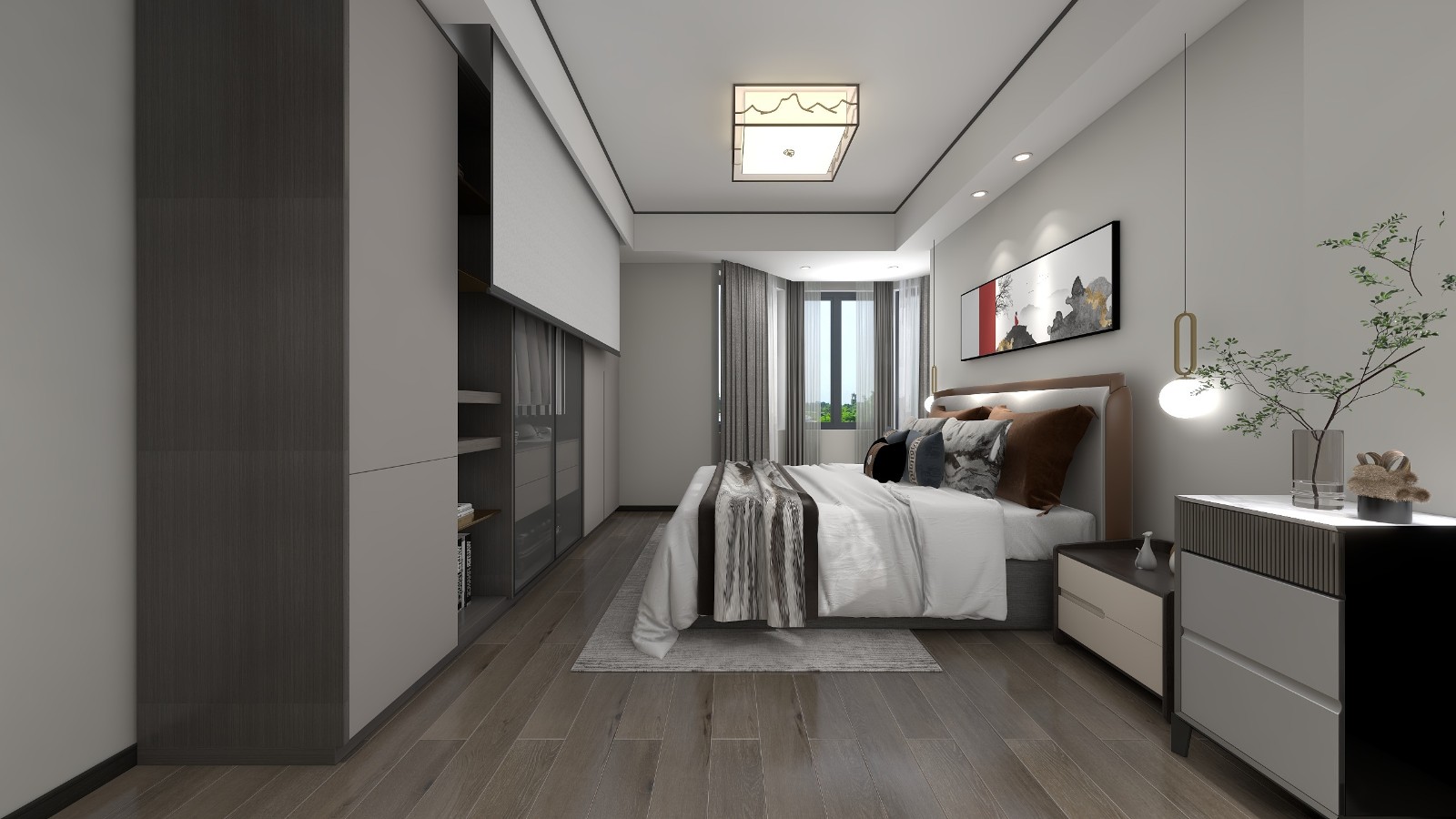 次卧,虽说是次卧,但同样是古典与现代碰撞,山水图的壁画棉麻质地的窗帘,配上开放式的衣橱和电动窗帘,年轻人格局一下子打开了。