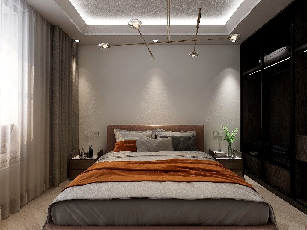 主卧:床头不必做过多装饰,简约现代风线条灯点缀清爽明亮