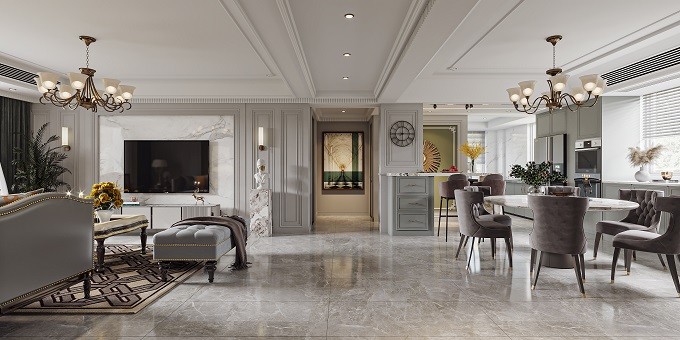 客厅电视墙采用墙板和大理石结合,美式风格的质感清晰可见