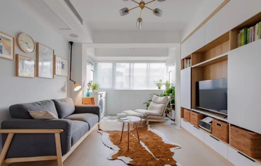 原木元素能轻松给人回归自然的感觉,无论是沙发,茶几亦或是动物形状的毛毯,装饰画,简单而多余的装饰,无不表达着自然,环保,平易近人的舒适之感。