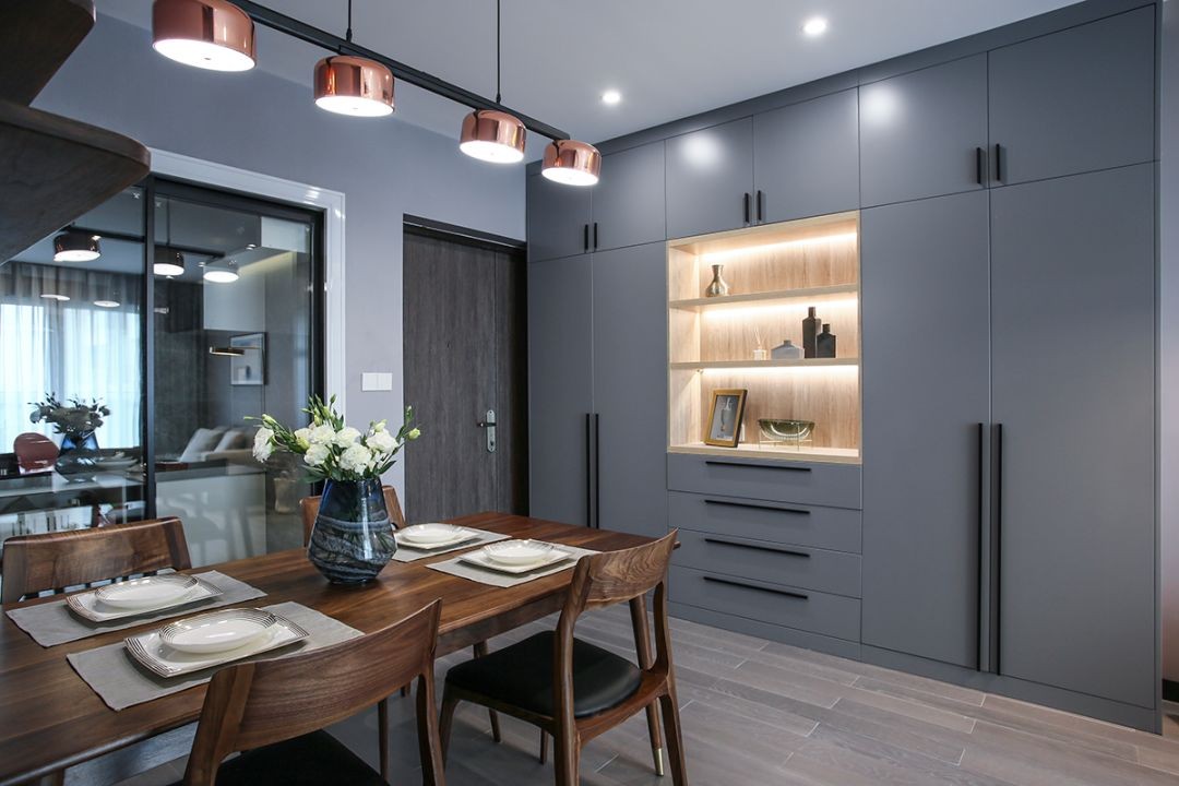 复古的木质餐桌椅到灰色调的背景,金属质感的吊灯,整个餐厅看起来非常有格调感。在餐桌椅侧方加上隔板的设计,增强储物能力。