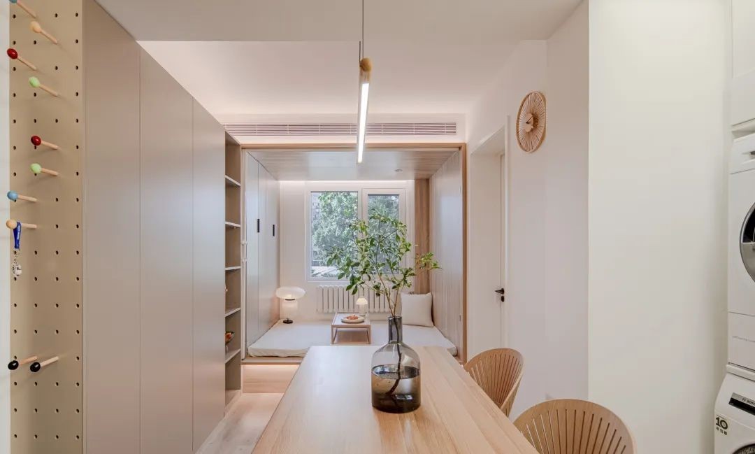 由于目前常住人口只有夫妻二人,家中的长辈偶尔来居住,压缩了原次卧面积后,保留了一个榻榻米空间,平日里可以作为休闲区,与餐厅可以保持交流与互动。