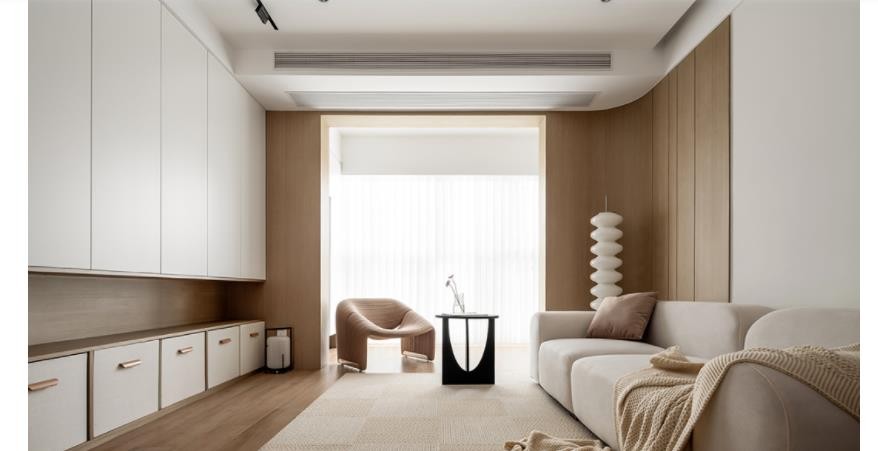 客厅提供了自由的成长空间,整墙收纳荡开生活繁琐,梳理出恰好的恬淡。
