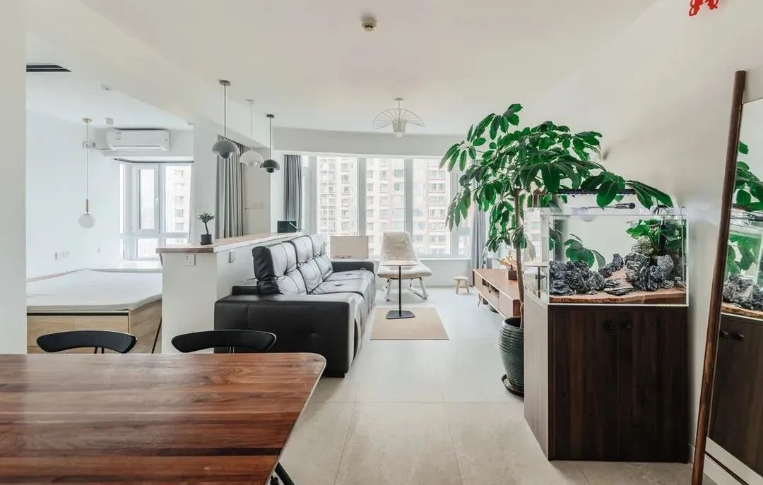 不是所有的沙发都是靠墙摆放的,它家的沙发是用来分隔客厅与次卧的。沙发后 ,上方采用木制的桌面,瞬间变成美观实用的小吧台。放上一两件装饰品,整个空间又被美化了几分。